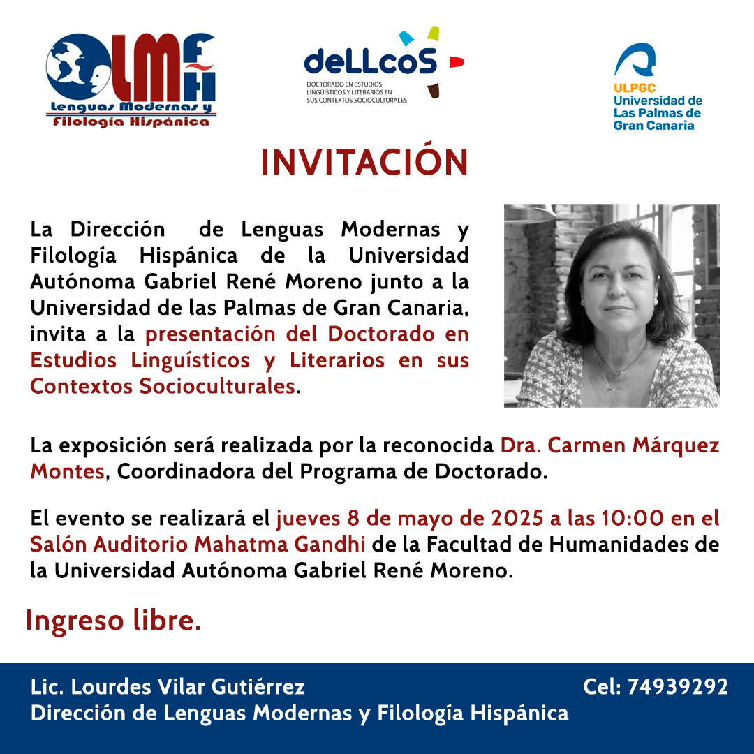 6 de mayo de 2025 Presentación del Programa de Doctorado DELLCOS en la Universidad Autónoma Gabriel René Moreno La Doctora Carmen Márquez Montes, coordinadora del Programa de Doctorado e...